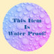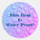 "This Item Is Water Proof" Sticker with bold blue text and water drops on Blue and Pink background or Personalise with your message and photo. Place on packages, etc. Great for any size business, large or small.
