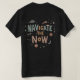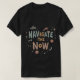 This t-shirt design features the phrase "Navigate the Now." in bold, geometric letters, creating a modern and eye-catching look. The text is set against a dynamic backdrop of colourful shapes and lines, suggesting movement and energy. The overall design conveys a sense of forward momentum and encourages the wearer to embrace the present moment.