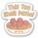 A doodle of a cute meatballs, tomato sauce and spaghetti pasta. The funny positive motivational pun caption reads "This Too Shall Pasta!" instead of "This Too Shall Past".