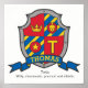 Knights style shield monogram T art name poster perfect for a boys bedroom or playroom in shades of red, yellow, blue and grey. Personalise with your child's own name and name meaning for a truly personalised touch to your child's bedroom or nursery, this example is for the name Thomas Twin. Witty, charismatic, practical and athletic. Poster print ideal for a gift to a new baby boy, for a christening, baby naming or baby shower gift. Unique shield drawing, graphic art and design by Sarah Trett. www.sarahtrett.com for www.mylittleeden.com