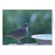Caught in the act of flipping some drops of water at his audience, this thrasher bird looks out at you in a startled glance, open beak still gaping, his white water dish just in front of him. Against a blurred green background, this grey-backed bird with a bit of white at his throat is standing on a rock wall in my sister's backyard near Tucson, AZ. Copyright Gail Storrs 2007.