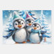 Three adorable penguins stand in festive winter hats and colourful scarves. Their big, round eyes shine with joy, while their fluffy white bellies contrast with the bright blue Christmas tree decorated with twinkling lights. The penguins smile happily and seem ready to celebrate the magic of the holiday season. All around them, delicate snowflakes dance through the air, while twinkling stars shine in the sky, creating a warm, festive atmosphere. This design perfectly captures the spirit of Christmas - full of joy, friendship and winter wonder!
