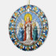 Stained glass design of three angels. The centre angel has long hair and looks feminine. The other angels are on either side of the centre one and are kneeling and look male. Different coloured mosaic around the perimeter.