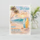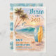 Make waves with this “Three at the Sea” retro surf beach birthday invitation — perfect for any little beach bum turning three! This hand-painted watercolor design features a dreamy tropical shoreline at sunset, complete with surfboards in the sand, scattered seashells, rolling ocean waves, swaying palm trees, a playful dolphin leaping through the surf, and a soaring seagull. Splashy turquoise and burnt orange hues give the whole design a vintage surfer vibe.
