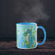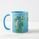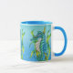 This coffee or tea mug is circled with three blue and green seahorse dragons wrapped in green seaweed on shades of water blue with bubbles.