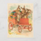 Easter Bunnies delivering eggs in a red car. Vintage Victorian greeting card.