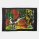 Beautiful and brightly coloured oil on canvas painting by German artist Franz Marc entitled, "Three Cats". The cat in the foreground is black and white, standing on its front paws with back legs in the air, while one yellow cat and a large red cat are in the background. Wonderful combination of reds, greens, yellows and purple. Completion date: 1913.