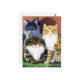 Postcard in a portrait of three cats with serious attitude - these guys mean business - a Russian Blue, a brown and white Persian, and an orange and white, tiger striped tabby