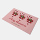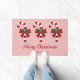 Destei's original illustration of three red and white striped Christmas candy cane treats decorated with a red bow and a Christmas holly / Common holly plant. The background colour is pink. There are also two personalizable text areas.