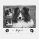Personalizable pet photo template that has slots for three custom photos. There is one large photo and two smaller photos placed over the large one. There is also a personalizable text area for a name. On each side of the text there are black dog paw print silhouettes.