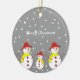 Three cute snowmen custom Christmas ornament featuring three adorable snowmen with red hat, yellow scarf, button eyes and sticks on a grey background with snowflakes.