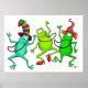 Three dancing frogs with hats, stiletto shoes, and fabulously gaudy necklaces are dancing the night away!