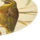 Artist W. Rutledge captured perfectly the vivid colours of those domestic birds. Get this simple yet beautifully realistic painting. Side view of two yellow birds and one darker bird on a branch and looking in different directions.