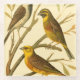 Artist W. Rutledge captured perfectly the vivid colours of those domestic birds. Get this simple yet beautifully realistic painting. Side view of two yellow birds and one darker bird on a branch and looking in different directions.