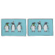 Destei's original illustration of three festive Gentoo penguins holding colourful Christmas lights with their beaks. One penguin is wearing a green scarf, another one is wearing purple ear protection and the third penguin in the middle is wearing a red and white Santa hat. The background colour is light blue.