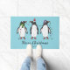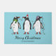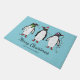 Destei's original illustration of three festive Gentoo penguins holding colourful Christmas lights with their beaks. One penguin is wearing a green scarf, another one is wearing purple ear protection and the third penguin in the middle is wearing a red and white Santa hat. The background colour is light blue. There are also two personalizable text areas.