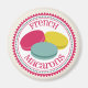A magnet featuring an illustration of three French macarons (pink, blue, and yellow) inside a decorative pink and blue circle with pink text.