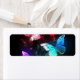 Three luminous, red, purple, green, textured, night butterflies on black luminous background.