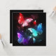 Three luminous, red, purple, green, textured, night butterflies on black luminous background.