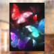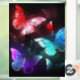 Three luminous, red, purple, green, textured, night butterflies on black luminous background.