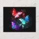 Three luminous, red, purple, green, textured, night butterflies on black luminous background.