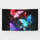 Three luminous, red, purple, green, textured, night butterflies on black luminous background.