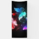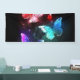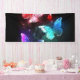 Three luminous, red, purple, green, textured, night butterflies on black luminous background.