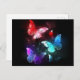 Three luminous, red, purple, green, textured, night butterflies on black luminous background.