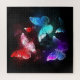 Three luminous, red, purple, green, textured, night butterflies on black luminous background.