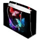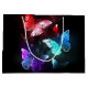 Three luminous, red, purple, green, textured, night butterflies on black luminous background.