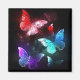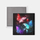 Three luminous, red, purple, green, textured, night butterflies on black luminous background.