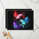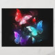 Three luminous, red, purple, green, textured, night butterflies on black luminous background.