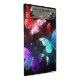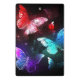 Three luminous, red, purple, green, textured, night butterflies on black luminous background.
