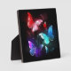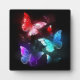 Three luminous, red, purple, green, textured, night butterflies on black luminous background.