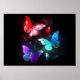Three luminous, red, purple, green, textured, night butterflies on black luminous background.