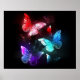 Three luminous, red, purple, green, textured, night butterflies on black luminous background.