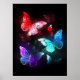Three luminous, red, purple, green, textured, night butterflies on black luminous background.