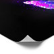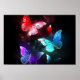 Three luminous, red, purple, green, textured, night butterflies on black luminous background.
