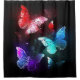 Three luminous, red, purple, green, textured, night butterflies on black luminous background.