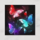Three luminous, red, purple, green, textured, night butterflies on black luminous background.