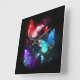 Three luminous, red, purple, green, textured, night butterflies on black luminous background.