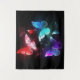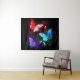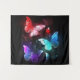 Three luminous, red, purple, green, textured, night butterflies on black luminous background.