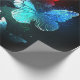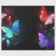 Three luminous, red, purple, green, textured, night butterflies on black luminous background.