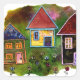 Art by Marta Harvey. The houses were created with painted papers made with different techniques, and edged with gel pens. The background was made with painted paper towels. The flowers were made with a round hole punch on painted papers and then the petals, leaves and stalks drawn with pen and ink.