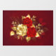 The composition of two artistically painted red roses and one golden rose, decorated with gold, jewel leaves on textured background.