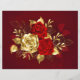 The composition of two artistically painted red roses and one golden rose, decorated with gold, jewel leaves on textured background.