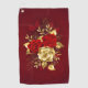 The composition of two artistically painted red roses and one golden rose, decorated with gold, jewel leaves on textured background.