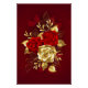 The composition of two artistically painted red roses and one golden rose, decorated with gold, jewel leaves on textured background.