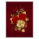 The composition of two artistically painted red roses and one golden rose, decorated with gold, jewel leaves on textured background.