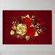 The composition of two artistically painted red roses and one golden rose, decorated with gold, jewel leaves on textured background.